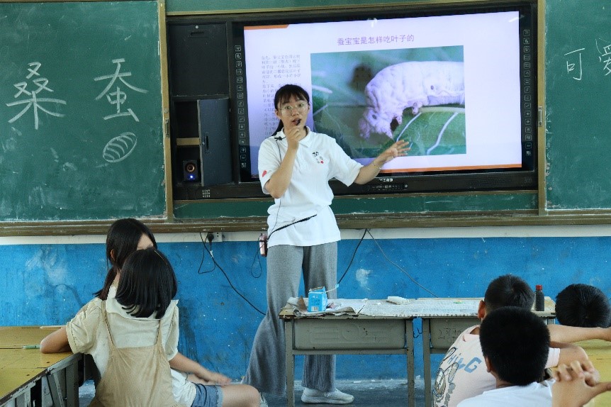 孩子们虽身处内陆的乡村,但对大海和科技充满向往,在宁肸贤等支教队员的讲授下,孩子们跨越内陆来到海洋,“乘着”辽宁舰环游太平洋,感受了船舶与海洋的魅力;跨越历史长河,从蚕宝宝身上感受“一带一路”倡议的前世今生。