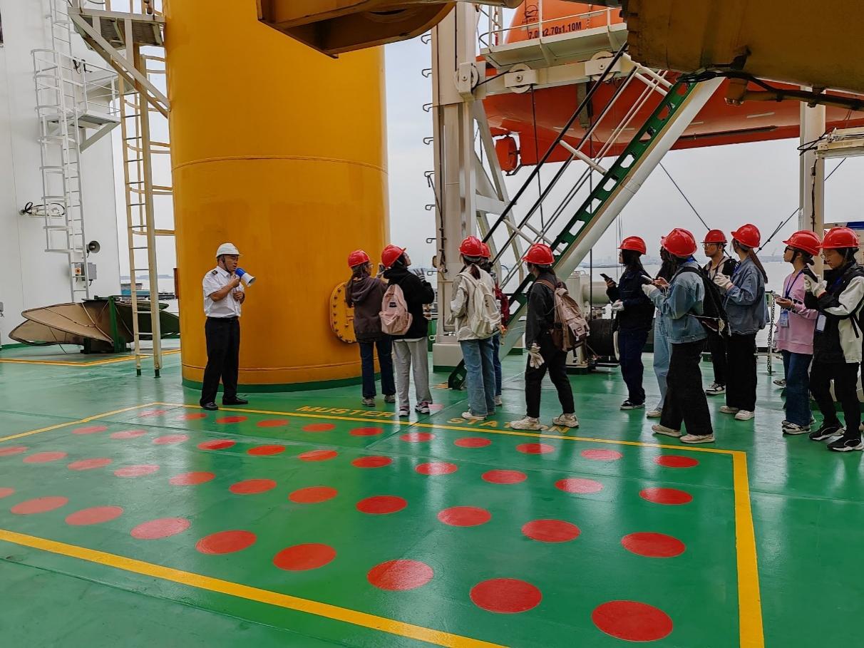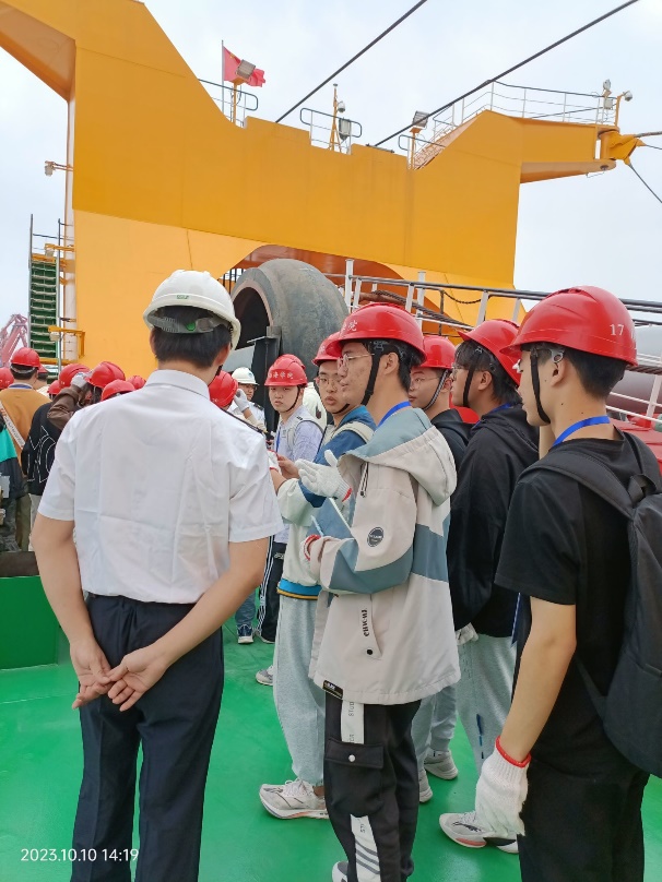 现场参观环节,在登船安全教育后,疏浚重器“长狮18”绞吸船的船长滕敬田和五位工作人员带领大家登上了这艘长江内河最大自航绞吸挖泥船。通过现场讲解,同学们熟悉了绞吸船的组成及其工作原理、疏浚作业的流程等,对后续专业课程的学习有极大的帮助。