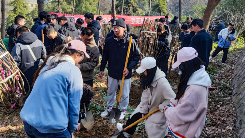 祭扫仪式结束后,同学们去现场栽种绿植。挖坑、回填、栽植、覆土,有条不紊地进行每一步操作。伴着和煦春风,大家劳动着,欢笑着,纵使有汗水流淌,植树活动本身也让大家感受到意义,每一棵树苗都寄托着对先烈的缅怀和对未来的期望。
