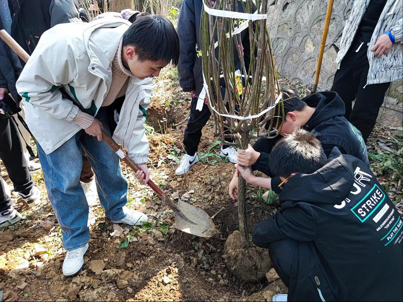 种植的绿植包括红梅和红叶石兰球等,它们不仅象征着坚韧不拔、奋勇向前的革命精神,更代表着新时代青年对绿色生态的守护与追求。在同学们的共同努力下,一棵棵树苗在烈士陵园的山坡上挺立起来,为这片革命圣地增添了新的生机与活力。