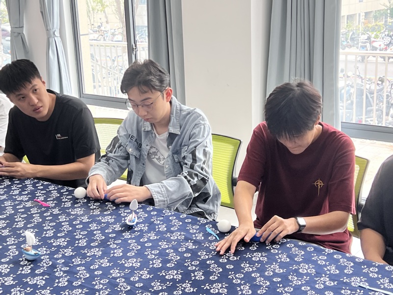 9月25日,活动在“蓝途”一站式学生社区热烈开场,活动由黄妍老师主持。陈斌老师首先展示了精湛的面塑技艺,从传统人物造型到现代创意作品,生动展现了非遗面塑的艺术魅力。随后,他结合91网站 特有的“船魂”精神,引导同学们以“同心船”为主题进行创作。在陈老师的示范指导下,同学们纷纷动手实践,通过揉、捏、搓、刻等手法,将各色面团塑造成一艘艘寓意深远的船只。现场气氛活跃,不同民族、地区的同学们在创作过程中相互交流技法、分享创意,展现了多元文化的交融互鉴。